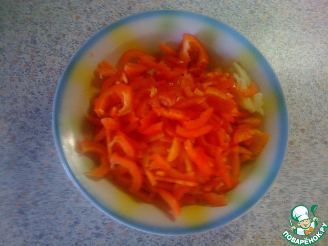 У болгарского перца удаляем середину вместе с семечками и режем соломкой.