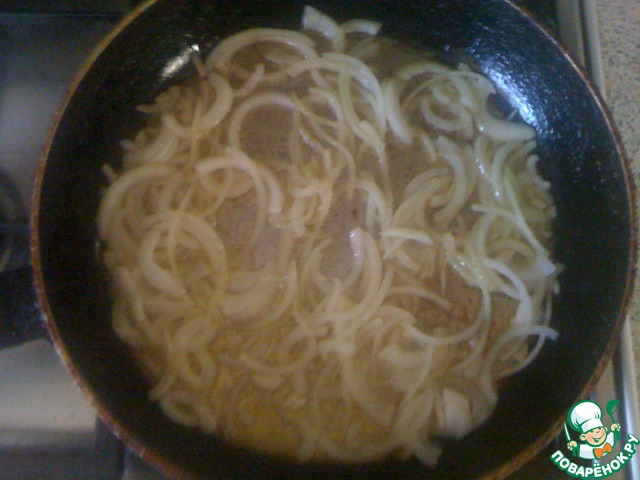 Лук режем тонкими полукольцами и обжариваем на сковороде в двух столовых ложках оливкового масла до золотистого цвета.
