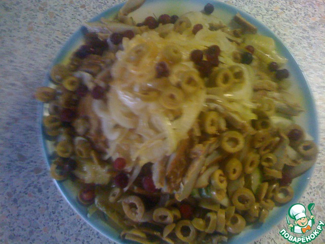 Оливки режем кружочками, мелко крошим 3 кружочка лимона и зелень. Добавляем клюкву.