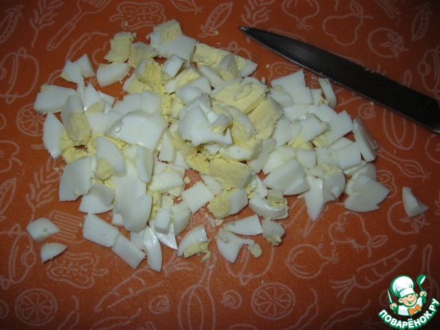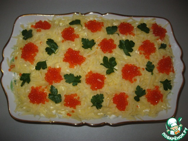 Украшаем наш салатик икрой. Можно украсить как у меня или полностью закрыть весь сыр. Кому как больше нравится.