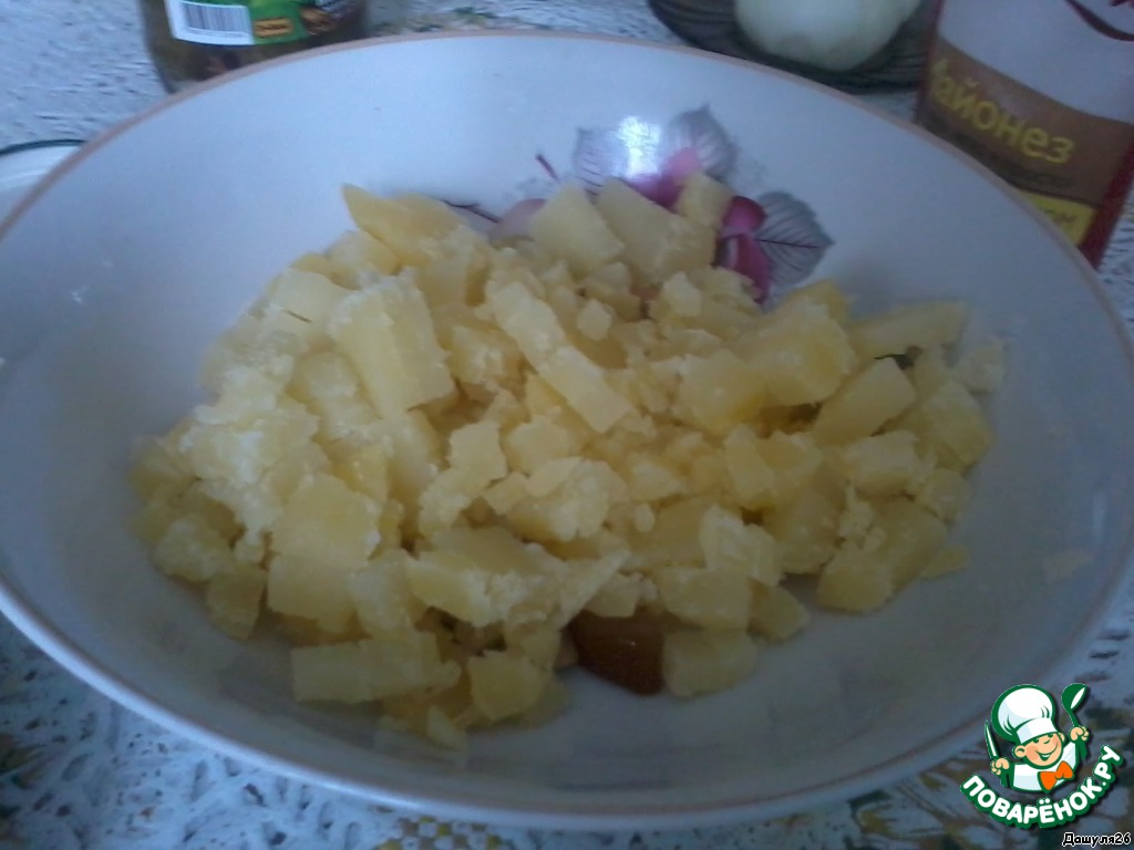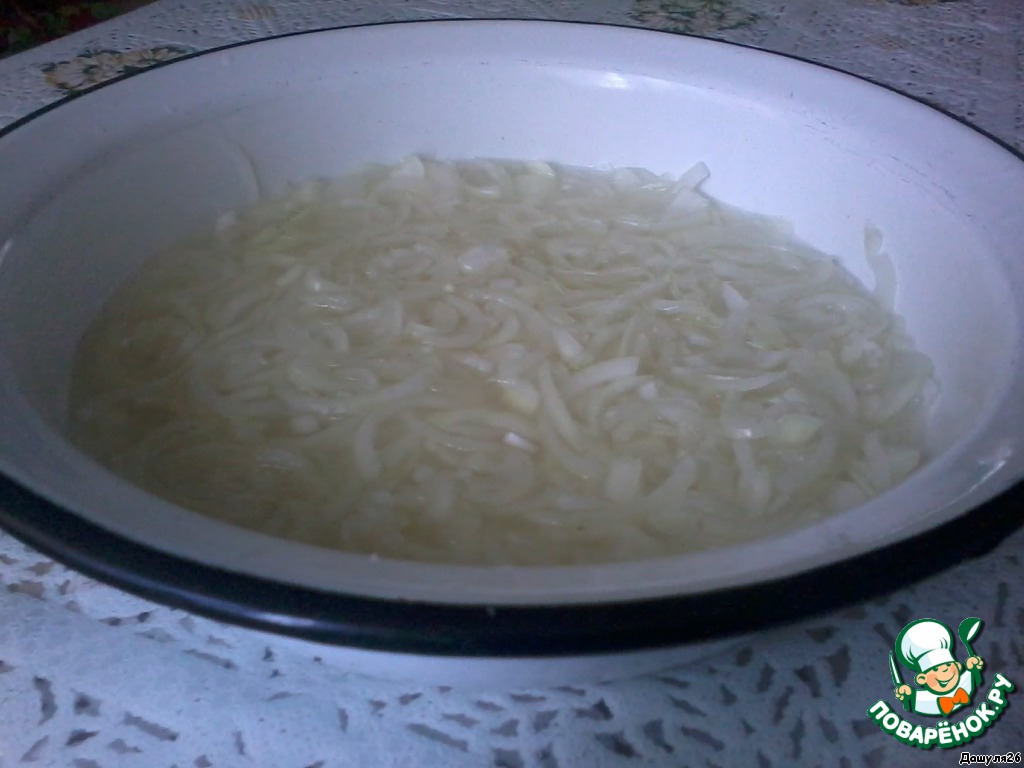 1) Лук порезать полукольцами и замариновать в уксусе с сахаром и солью.