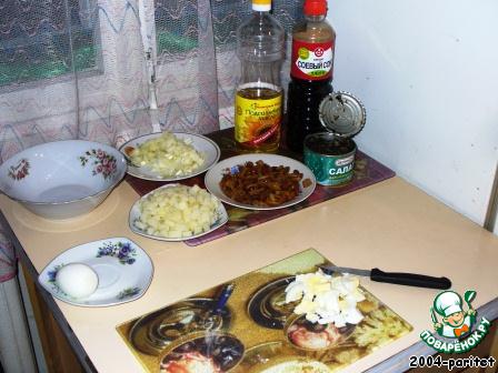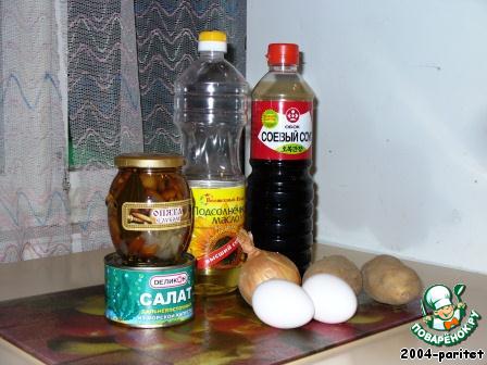 1 луковица, 2 средних картофелины, 2 яйца, 1 консервная банка морской капусты, 1 банка 350 миллилитров маринованных опят, 1 столовая ложка соевого соуса, 2 столовые ложки растительного масла.
