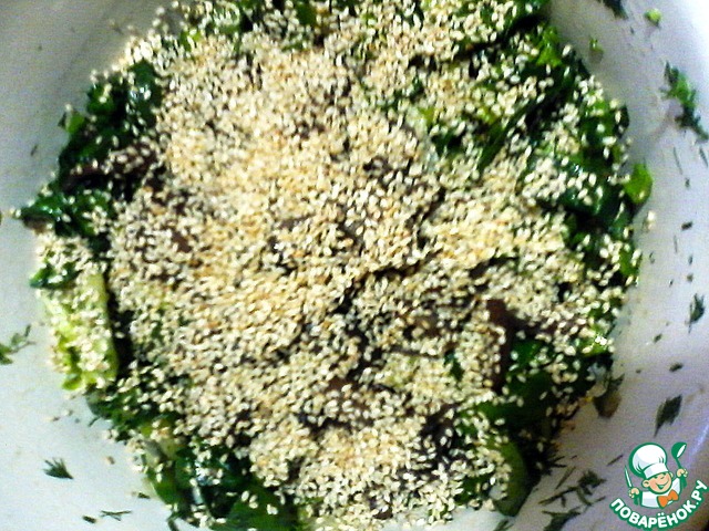 Петрушку и укроп мелко нарезаем. Шпинат шинкуем покрупнее - полосками примерно по 0,5 см. Все ингридиенты складываем в глубокую миску