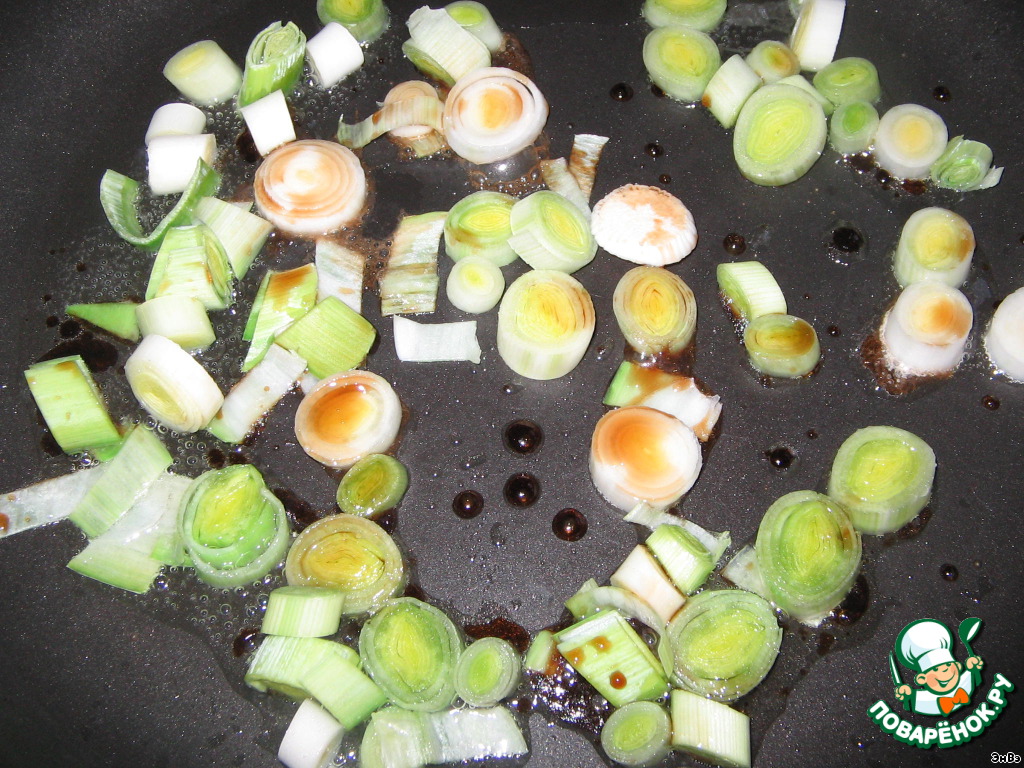 На сковороду выливаем немного масла, выкладываем лук порей, поливаем соевым соусом и тушим под крышкой. Не до полной готовности. Это касается всех овощей, они должны быть не слишком сырыми и не слишком мягкими, т.е. должны быть готовы на 2/3, самую малость похрустывать. Готовый порей перекладываем в миску, куда дальше, по мере приготовления, будем класть все остальные овощи.