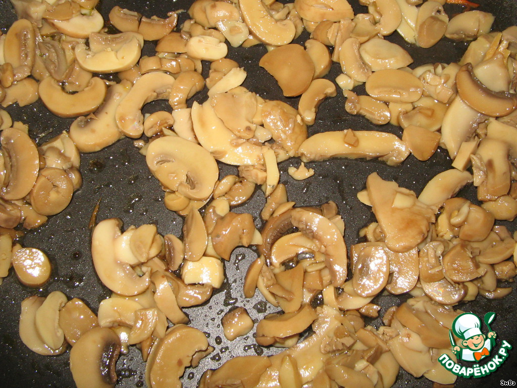 Так же как и все овощи, грибы кладем на сковороду, добавляем немного масла и соевого соуса.