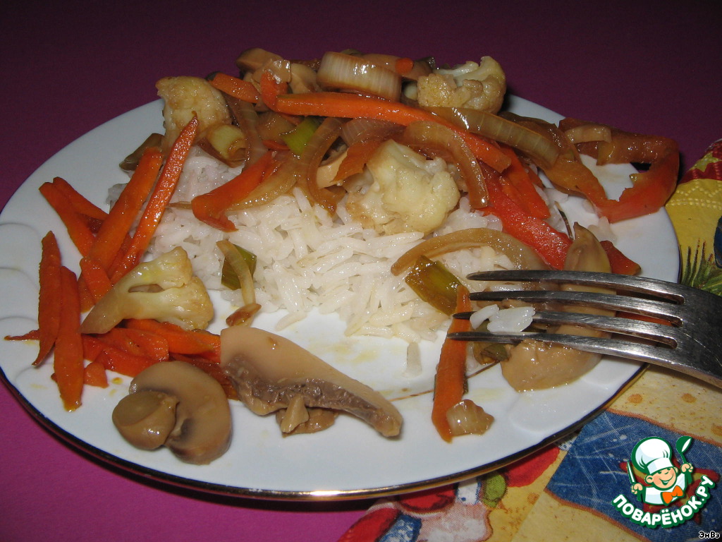 На подходящее по размерам блюдо кладем рис, сверху выкладываем овощи и подаем, пока все не остыло.