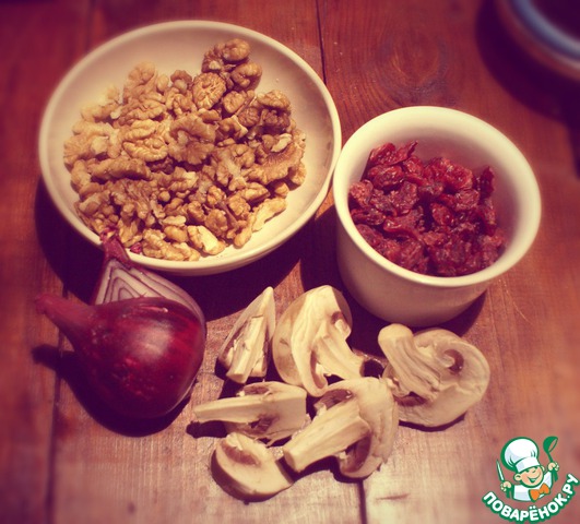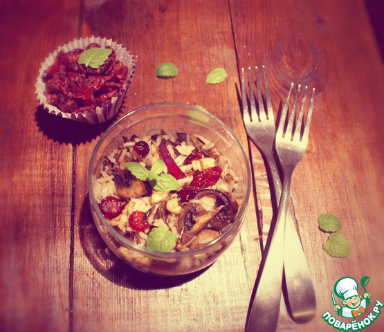 Смешаем грибы, лук, орехи, вяленную клюкву с диким рисом.