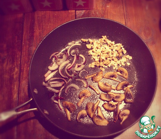 Свежие грецкие орехи разломать на кусочки, добавить к луку и шампиньонам.