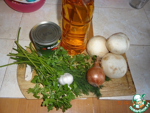 Фасоль и грибы перекладываем в салатник к луку. Добавляем зелень и чеснок, хорошенько перемешиваем и даем постоять 2 минутки, для того чтобы фасоль впитала аромат зелени и чеснока.