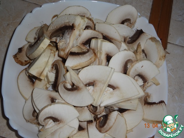 Пока лук жарится можно подготовить грибы. Моем и нарезаем так как вам нравится. Не забываем поглядывать на лук)