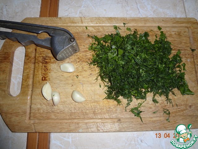Пока грибы жарятся моем и нарезаем зелень, чистим чеснок. Я беру примерно 3-4 зубчика, на мой вкус идеально