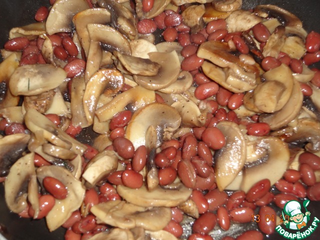 Открываем и сливаем фасоль. Как только грибы приготовились добавляем ее в сковородку. Помним, что фасоль уже готова и нам необходимо ее просто разогреть.