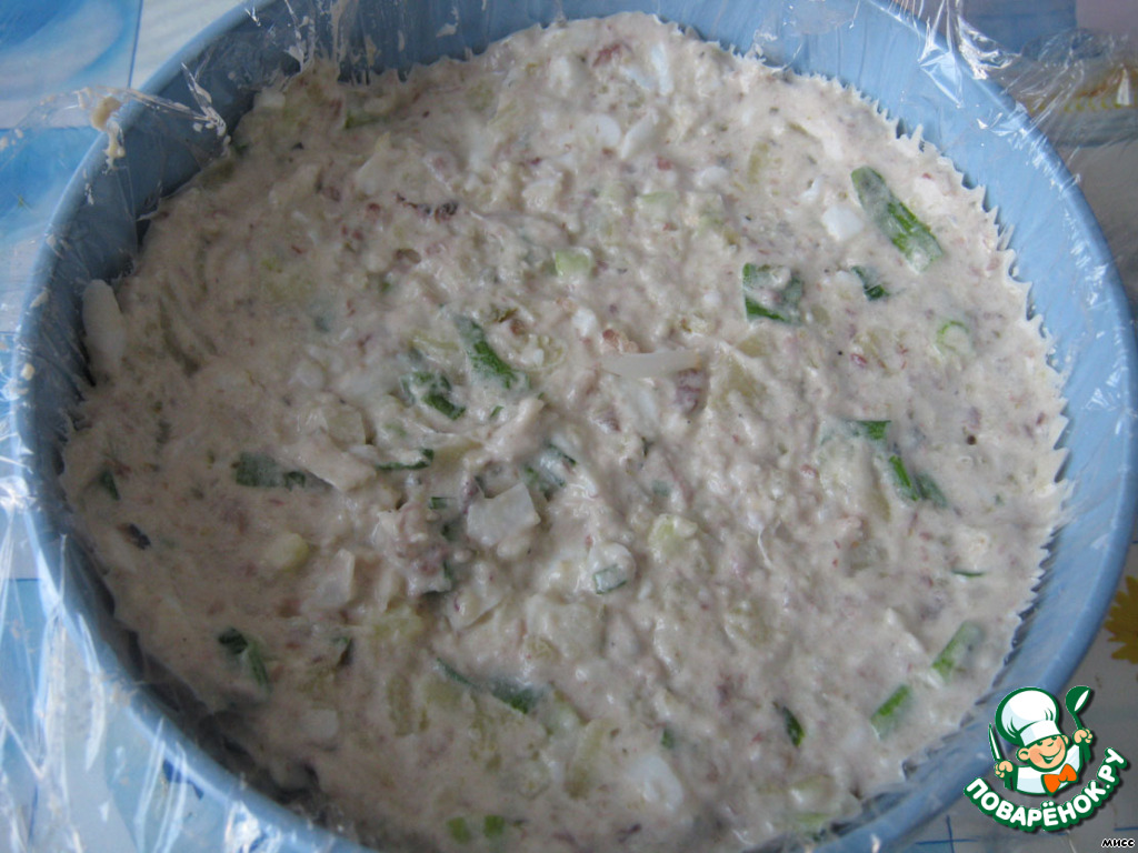 Всё перемешиваем с соусом. Далее я помещала в пиалку (можно большую бульонную кружку), выстланную пищевой плёнкой. Переворачиваем на тарелку и сверху натираем на мелкой тёрке сыр.