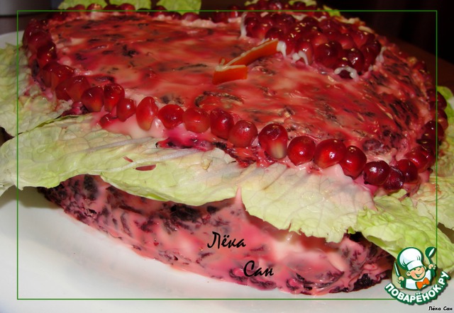 Последний слой из зерен граната. Советую выложить поверх всей площади салата, а не только по краю. (У меня не получилось из-за бегающих вокруг и подторопливающих голодных ртов :))