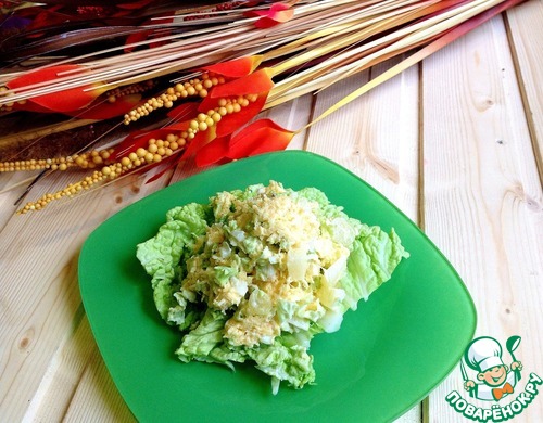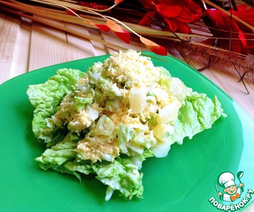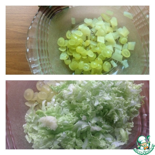 Ананасы нарезать мелкими кубиками, виноград кругляшками. Нарезать китайскую капусту соломкой (только зеленую часть), чеснок пропустить через пресс
