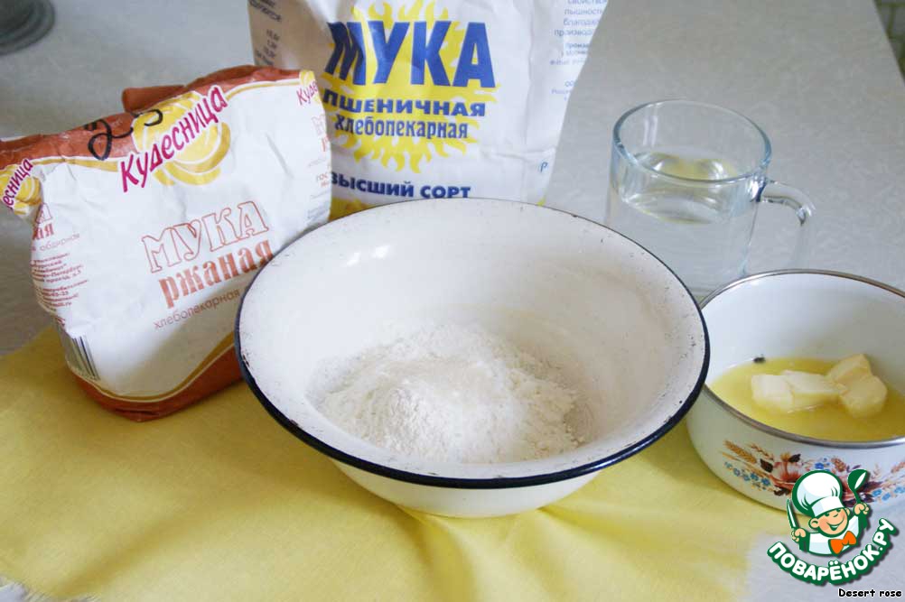 Замесить тесто для ржаных хлебцов. Смешать оба вида муки, добавить по щепотке соли и сахара, растопленное сливочное масло, стакан холодной воды и замесить тесто.