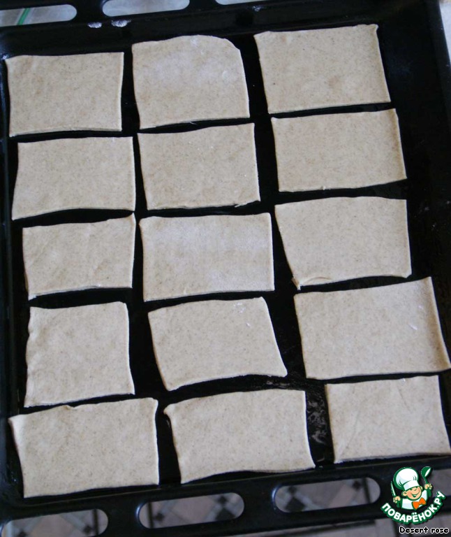 Раскатать тесто в пласт толщиной 2-3 мм. Разрезать на квадраты или прямоугольники.