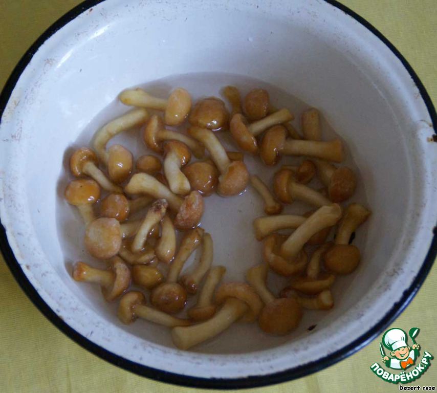Приготовить салат. Грибы залить небольшим количеством воды, посолить и потушить минут 5-7 (Мелкие опята можно не резать. Крупные и шампиньоны - измельчить). Воду слить