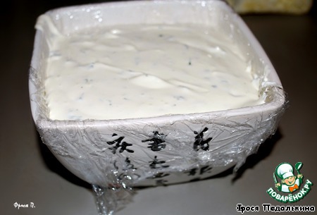Сметану и сыр взбить миксером, смешать с порезанной петрушкой.