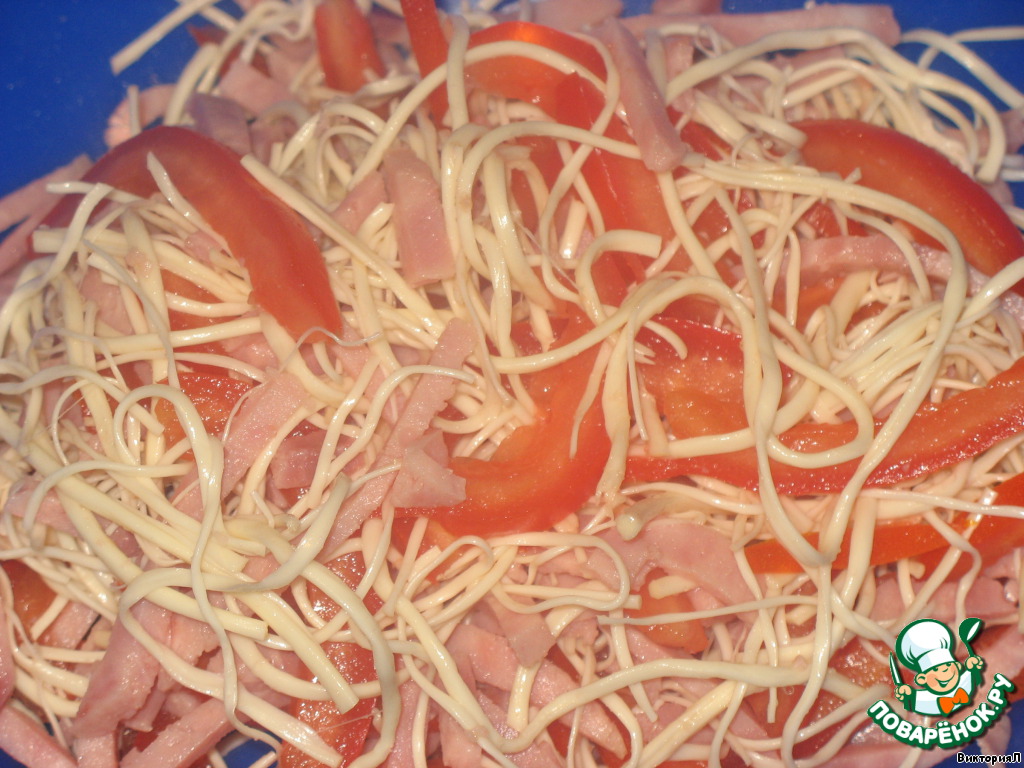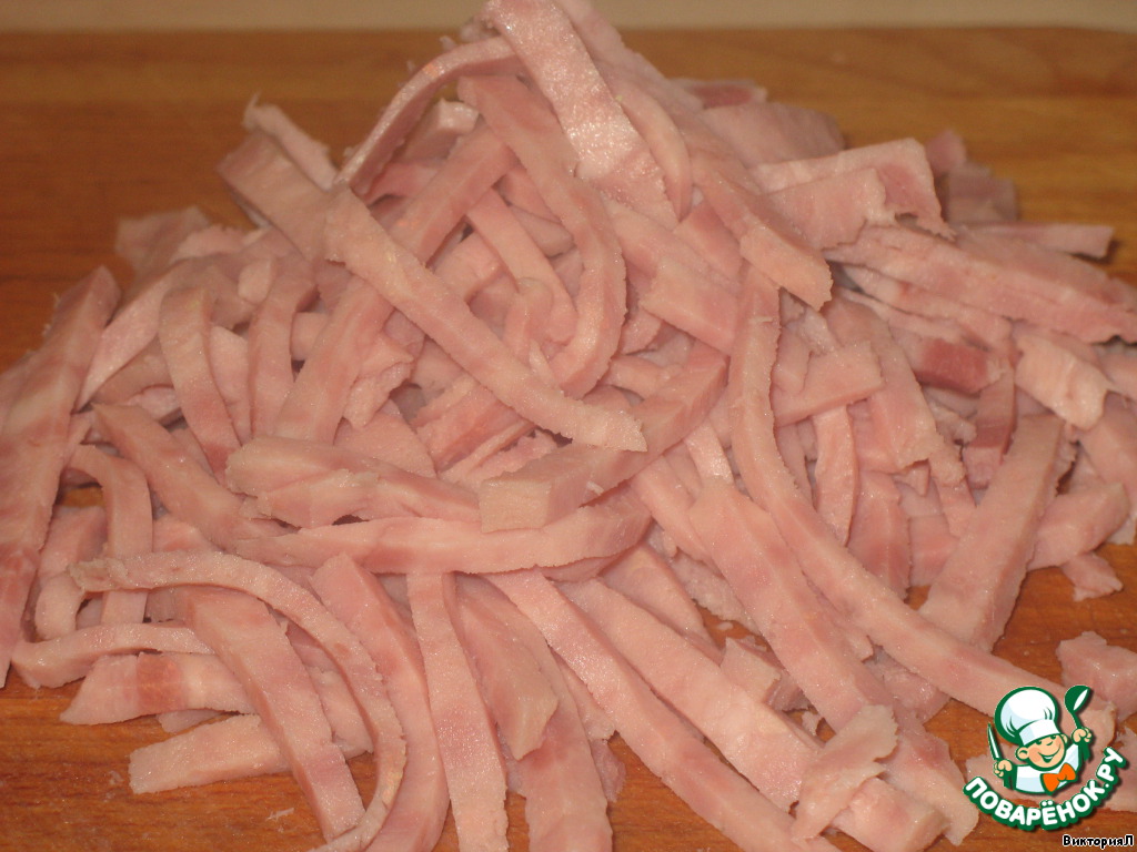 Ветчину нарезать тонкой соломкой.
