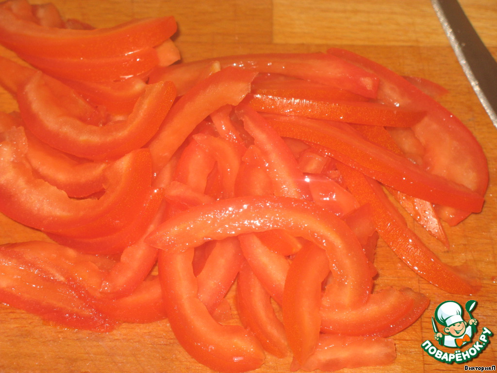 У помидор удалить семена и нарезать тонкими дольками.