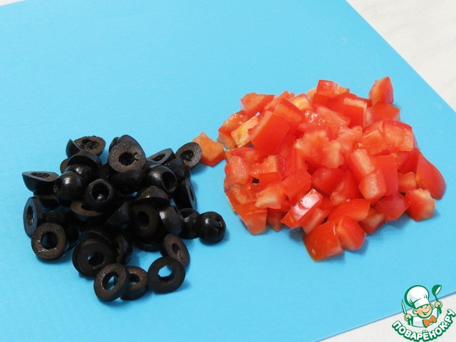 Помидоры очищаем от семян и нарезаем кубиком, оливки колечками.
