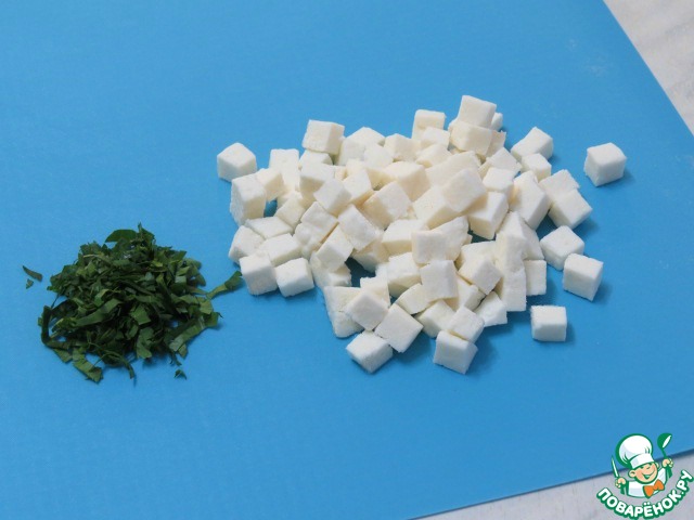 Сыр нарезаем кубиками, петрушку мелко рубим.