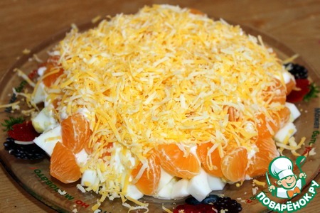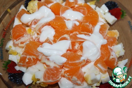 - мандарин порезать кусочками (разобрать на дольки, пленки желательно, но не обязательно, убрать)