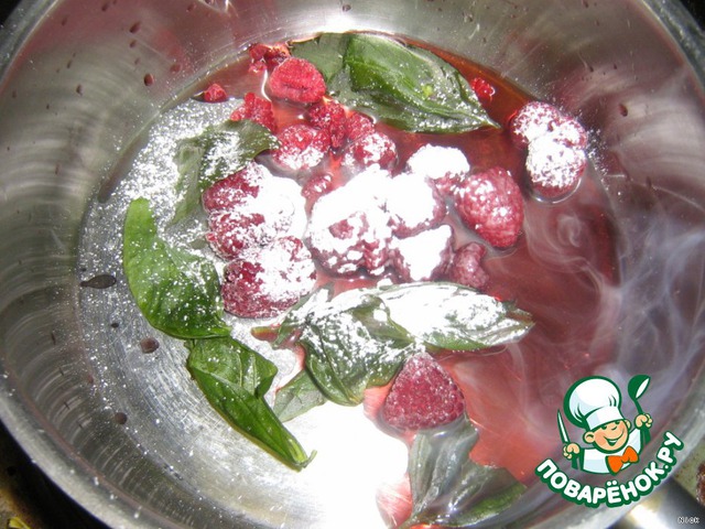 Готовим конфитюр: малину, базилик, красное вино и сахарную пудру провариваем 5 минут