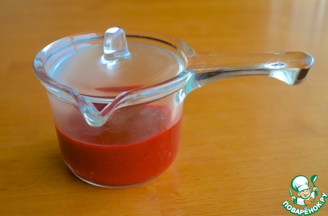 1. 50 г малины пюрировать в блендере и процедить через мелкое сито. Добавить сахар и разогреть до растворения сахара, постоянно помешивая.