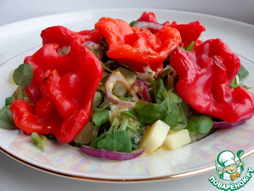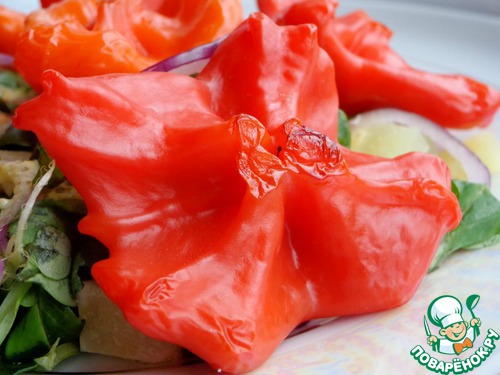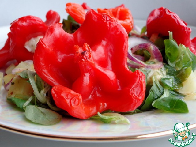 | Салат очень вкусный и простой в приготовлении. А фаршированные запечённые перчики придают ему оригинальность. Перцы можно взять любые: сладкие, острые круглые перчики чили, главное, чтобы они были маленькие. Я взяла средне-острый перец в виде колокольчиков, который вырастила сама. Его острота прекрасно сочетается с творожно-крабовой начинкой. |