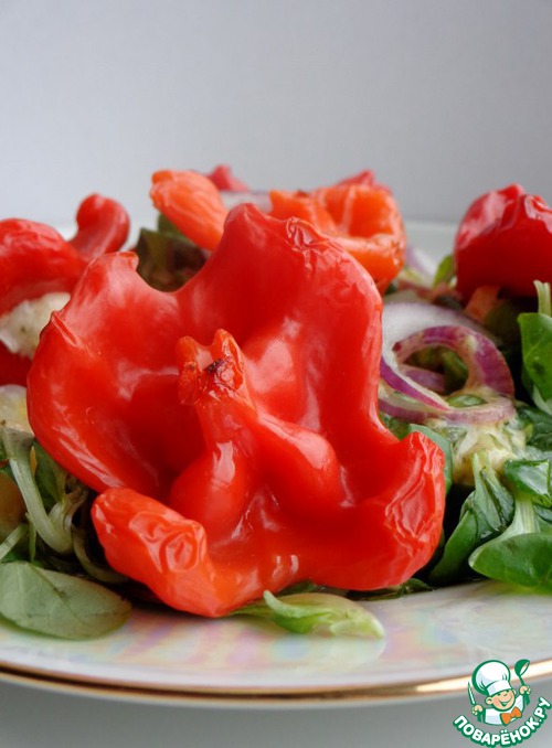 Слегка остужаем. Пока перец остужается, делаем сам салат. Рукколу (или любой салат по вкусу) помыть, обсушить, при необходимости нарезать. Красный лук нарезать тонкими кольцами.