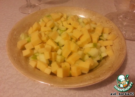 Моем яблоко, режем его кубиками. Сыр также режем кубиками и смешиваем с яблоком.