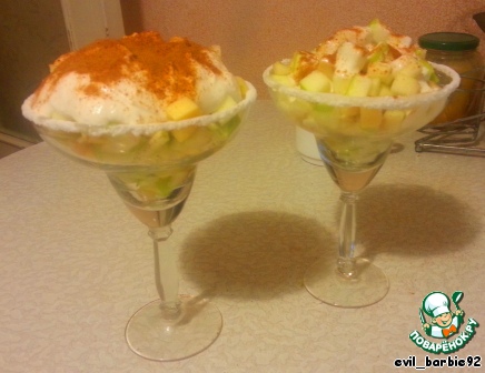Выкладываем в креманку яблоко и сыр, поливаем сметаной с сахаром и посыпаем корицей. Края креманки можно украсить, смазав их предварительно лимоном и окунув в сахарную пудру. Вместо сметаны и сахара можно использовать 50 г обезжиренного творога и три столовые ложки 1% -го кефира. В этом случае салат будет менее калорийным, но не менее вкусным! Приятного аппетита!
