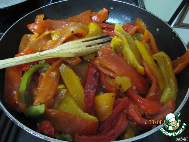 У меня не любят кожуру перцев, поэтому я их сначала испекла на газу и почистила. Порезать перцы на нетонкие полоски и обжарить с маслом и чесноком до мягкого состояния.