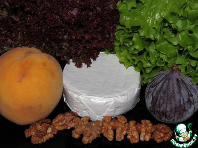 Для салата потребуется: Сыр Бри, инжир, персик, листья салата, грецкий орех.