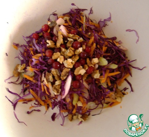 Добавим в наши овощи клюкву и грецкие орехи (можно использовать любые другие по Вашему усмотрению). Поливаем заправкой и аккуратно все перемешиваем.