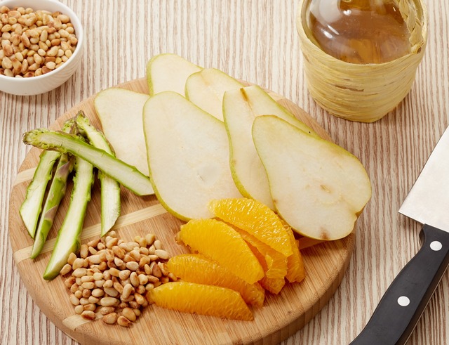 Грушу порезать пластинками, спаржу почистить. Почистить и разделить на сегменты апельсин. В салатный микс добавить порезанные черри, сегменты апельсина, соль, перец, сахар, масло, уксус — все хорошо перемешать и выложить на тарелку.