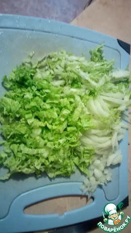 Салат помыть, обсушить, порезать. Хотя по правилам салат рвут, я порезала, т. к. у меня был китайский салат, а там черешки.