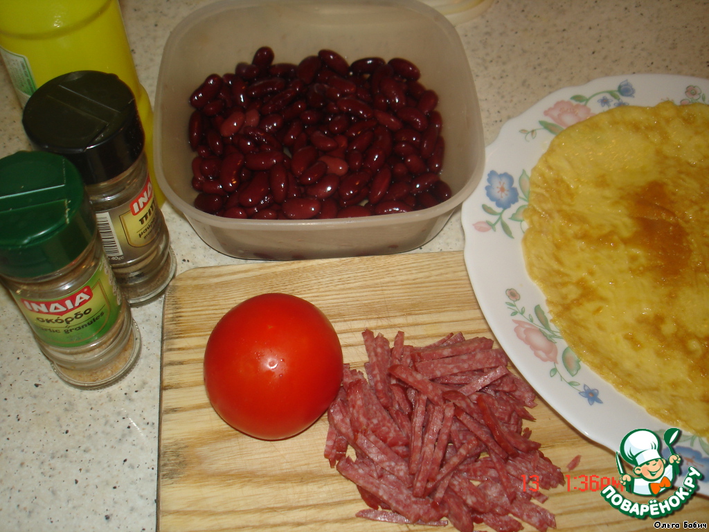 Яйца взбить, добавить соль, 1 ст.л. воды, пожарить омлет на оливковом масле.