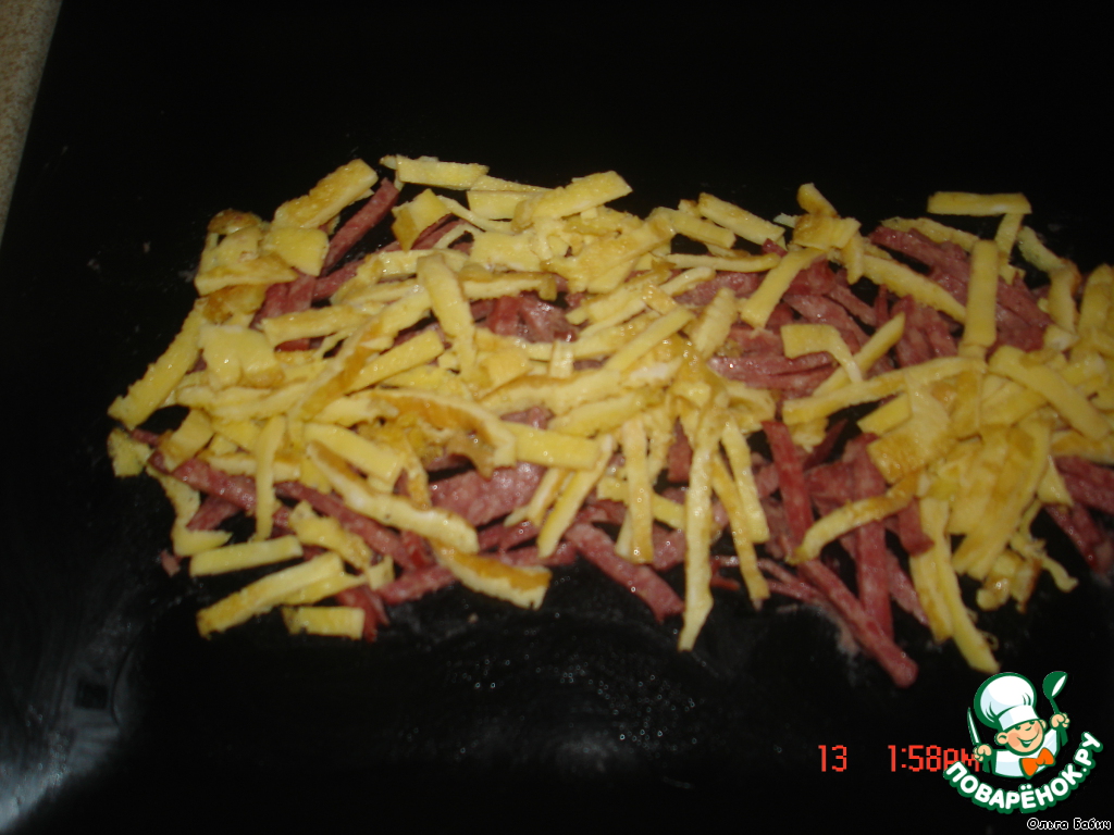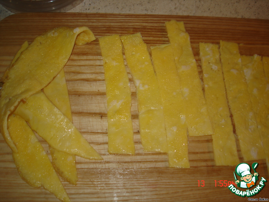 Нарежем омлет: неровные части режем мелко, полоски - для украшения.