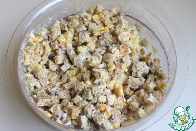 Затем добавляем майонез. Его кладем не жалея. Нам нужно чтобы все сухарики были в майонезе. Очень хорошо все перемешаем. И закрываем крышкой чашку, убираем примерно на 4 часа, я делаю всегда утром если подавать нужно вечером. Когда салат будет готов, cухарики напитаются майонезом и будут похожи как будто обжаренные в масле. Очень вкусное и сытное блюдо.