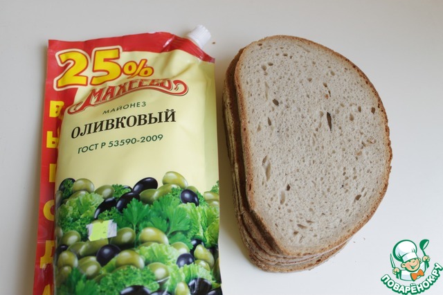 Итак, нам понадобится хлеб уже порезанный, лучше не белый, и майонез.