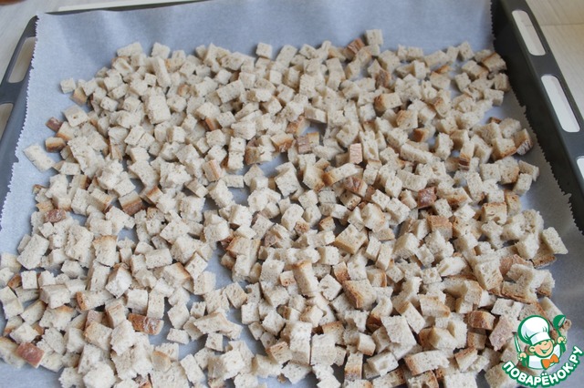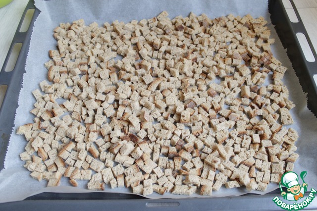 Итак у нас получится целый лист таких вот кубиков. Ставим их в духовку разогретую до 160гр примeрно на 25минут подсушить. При этом периодически перемешиваем их.