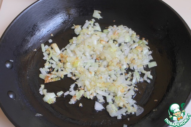 Лук тоже мелко порежем и обжарим на масле.