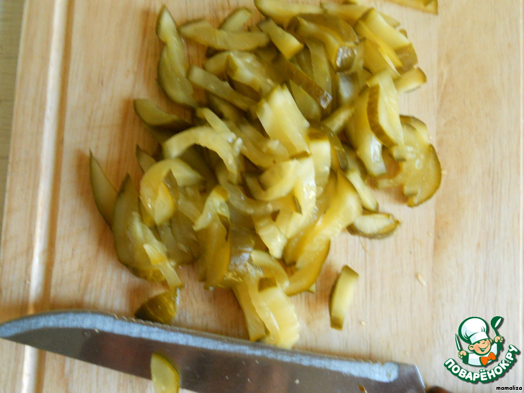 Консервированные огурцы нарезать соломкой, соблюдая пропорцию фасоли.