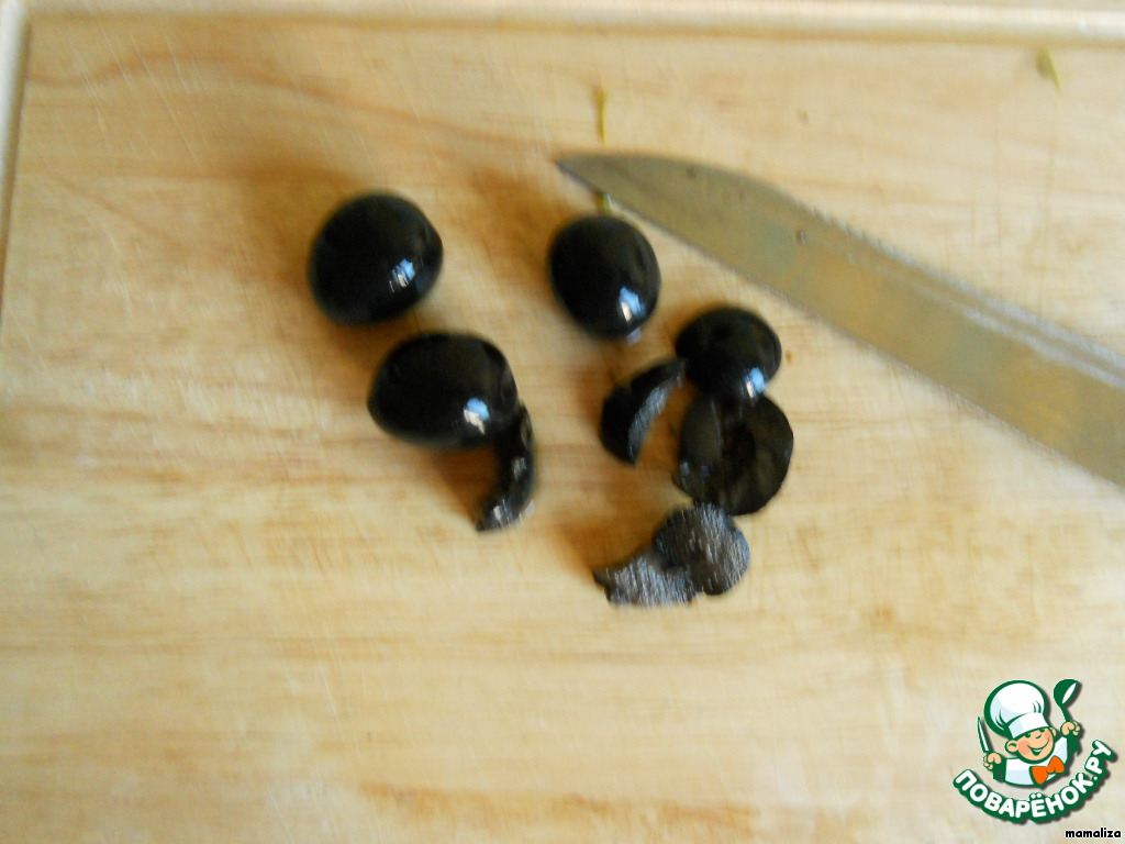 Маслины нарезать.