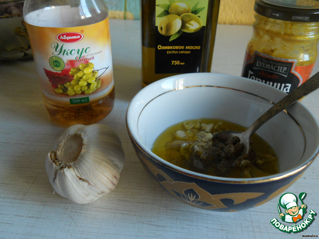 Приготовить заправку из оливкового масла, уксуса, горчицы, перца, сахара, чеснока. Все ингредиенты салата соединить, заправить соусом. Дать салату настояться в холодильнике около часа.