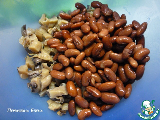 Положить в чашку отварную фасоль и нарезанные грибы.