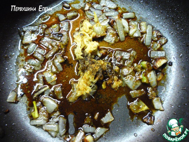 Разогреваем масло на сковороде. Режим кубиками чеснок и кладем на сковородку вместе с имбирем и красным перцем. Немного прогреваем. Добавляем соевый соус и минуты 2-3 кипятим, постоянно мешая.